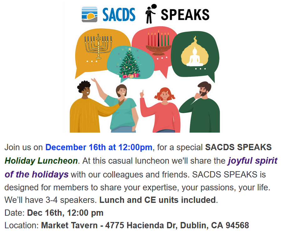 Join us on December 16th at 12:00pm, for a special SACDS SPEAKS Holiday Luncheon. At this casual luncheon we'll share...